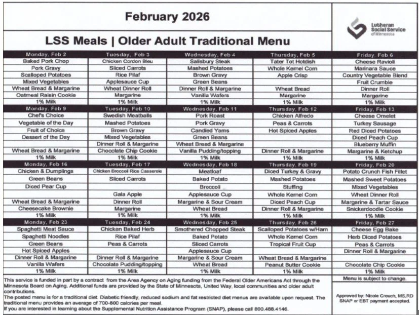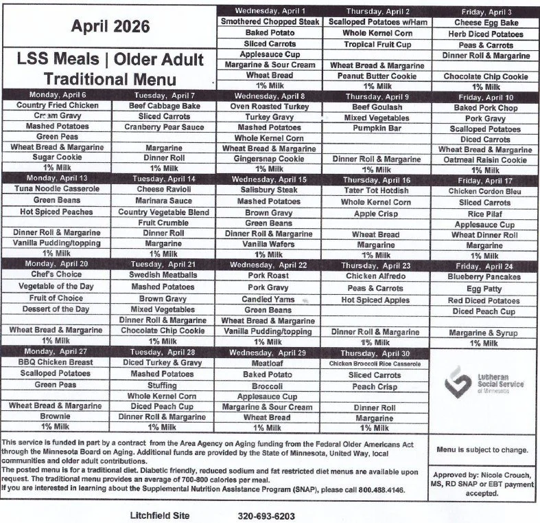Call at least 24 hours in advance at 320-693-6203 to order meals